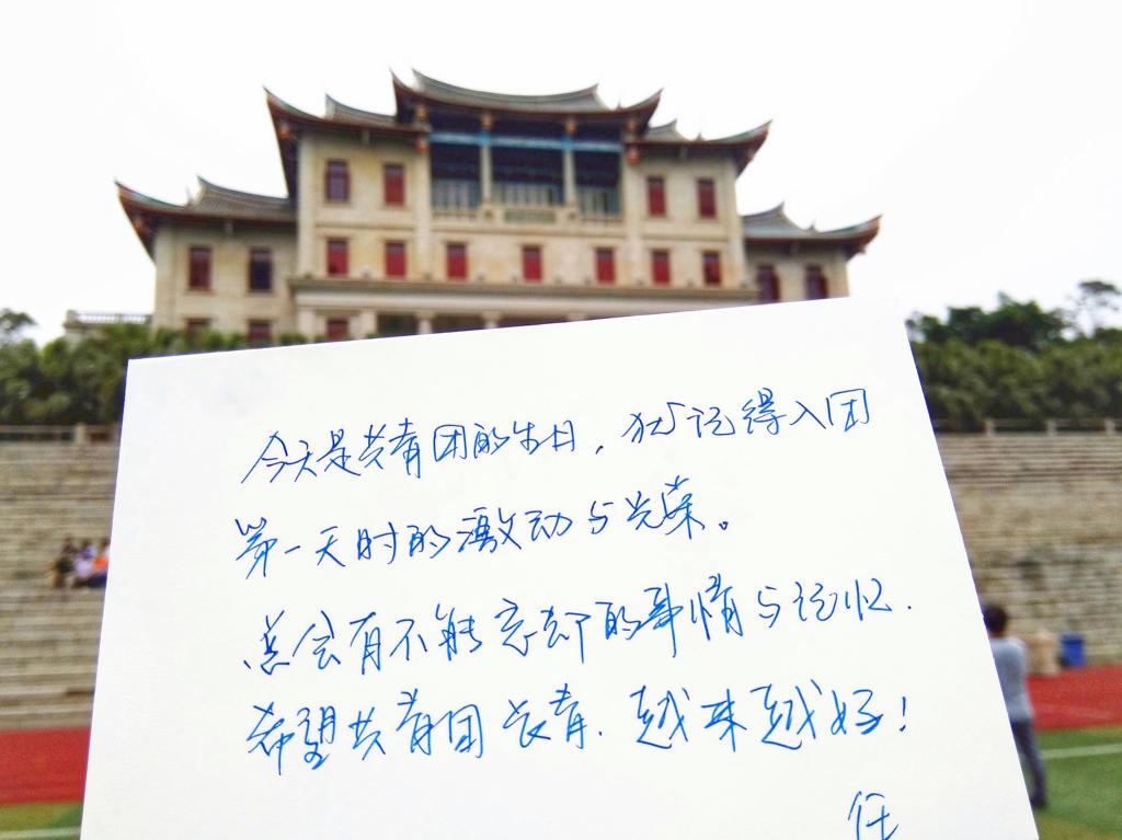 五四期间,外文学院举行新团员入团仪式。6名新团员在团旗下庄严宣誓,光荣加入中国共青团。在随后的沙龙交流中,团员同学们分享了自己“入团那一天”的记忆。一位团员写到:“犹记得入团第一天时的激动与光荣,总会有不能忘却的事情与记忆,希望共青团越来越好!”