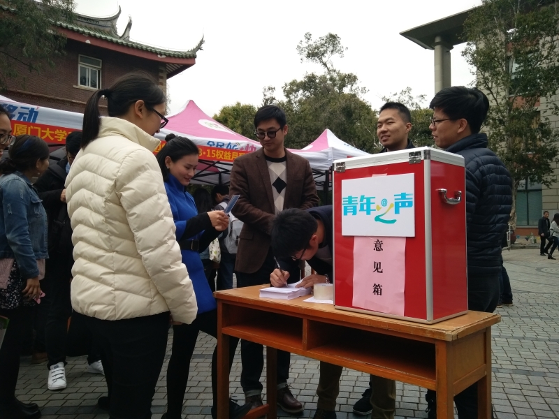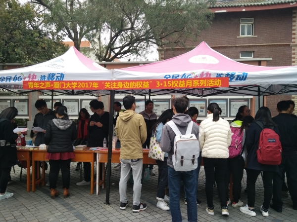 2017年3月15日,“青年之声·厦门大学2017年‘关注身边的权益’3·15权益月系列活动”在我校三家村广场举行。此次活动由校团委主办,校学生会、校研究生会承办。本次活动得到厦门大学保卫处、厦门大学后勤集团、大学路派出所、大学生法律援助中心等单位的大力支持。