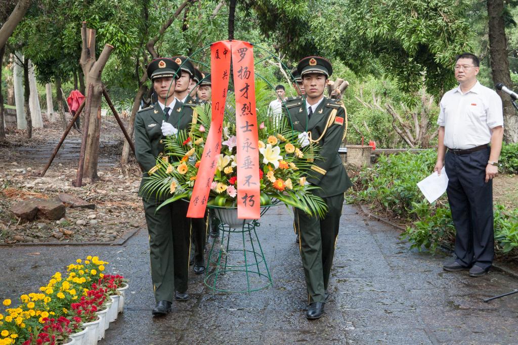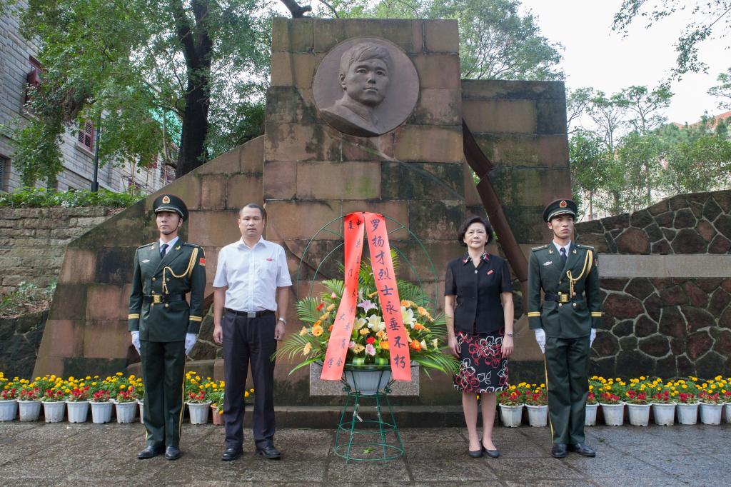 在庄严的罗扬才烈士雕像前,全体师生肃立,奏唱国歌,并向罗扬才烈士雕像三鞠躬。校党委副书记林东伟、副校长詹心丽,代表学校向罗扬才烈士雕像敬献花篮。
