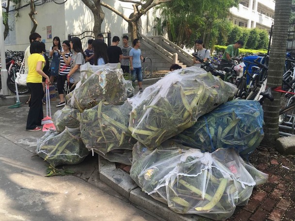 信息科学与技术学院的同学们在打扫海韵学生公寓的同时,发现刚刚集中的垃圾很容易被风吹走,也不利于垃圾车收集。在垃圾袋紧缺的情况下,同学们主动从自己的宿舍拆出个人蚊帐,用蚊帐包裹住清理好的垃圾,编制出一个个巨型“垃圾袋”,极大方便了后续垃圾清理。