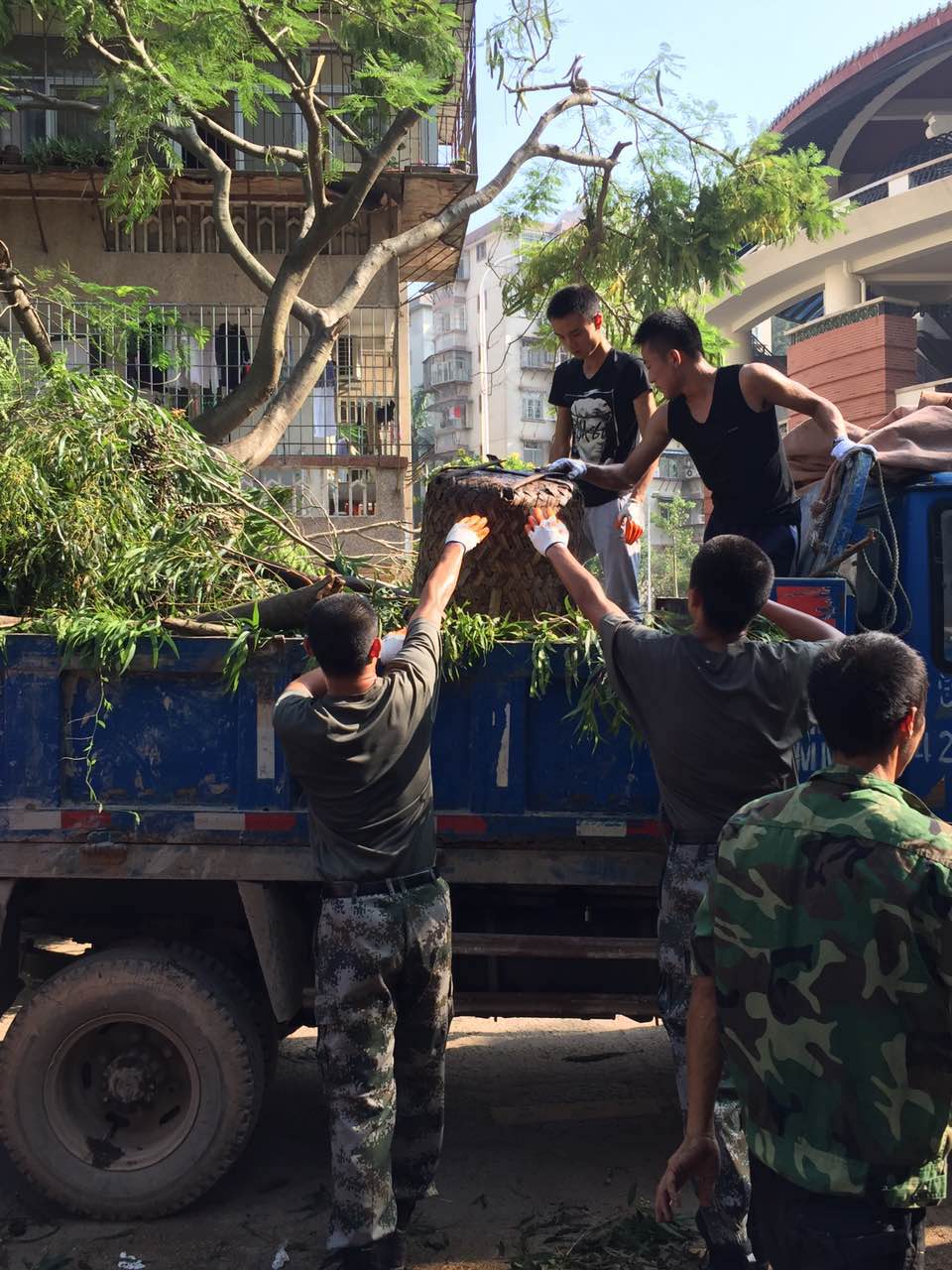 台风过境,信息科学与技术学院、物理科学与技术学院、航空航天学院、医学院国防生紧急召开骨干大会,迅速集结组建国防生防台抢险应急队,开赴核心区域和交通要道开展应急抢险。玻璃碎片、生锈的铁皮、倒伏的大树等等令人望而却步的危险和困难,丝毫没有挡住他们前进的脚步。应急国防生们扛起重责,发挥“特别能吃苦、特别能战斗”的精神,一部分进行道路清障,一部分在宿舍走廊清理玻璃和安全隐患,还有一部分进入宿舍,帮助排除积水,送去子弟兵的真挚关怀。