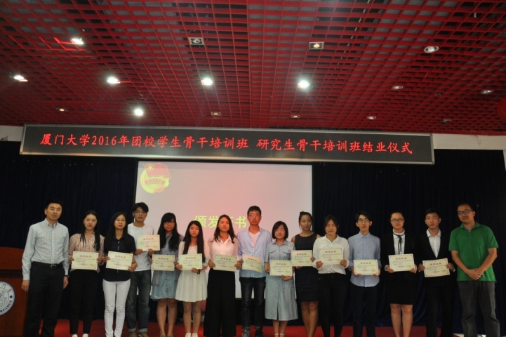 据悉,厦门大学2016年团校学生骨干培训班、研究生骨干培训班由校团委主办,校学生会、校研究生会承办,以我校入选全国首批“青马工程”研究培训基地为契机,加强我校学生干部队伍建设、切实提升学生干部的思想政治素质和工作能力水平。此次培训历时5周,涵盖理论学习、素质拓展、能力训练、交流研讨等培养环节,课程丰富,针对性强,效果显著,得到学员们的高度认可。大家纷纷表示,系统、专业的培训,强化了理论素养、提升了工作能力、拓宽了视野、激发了责任心,要以此为新的起点,把培训班的培训内容、实践体验和个人感悟带回到日常工作中,影响带动身边更多的同学参与到弘扬主旋律传播正能量中来。