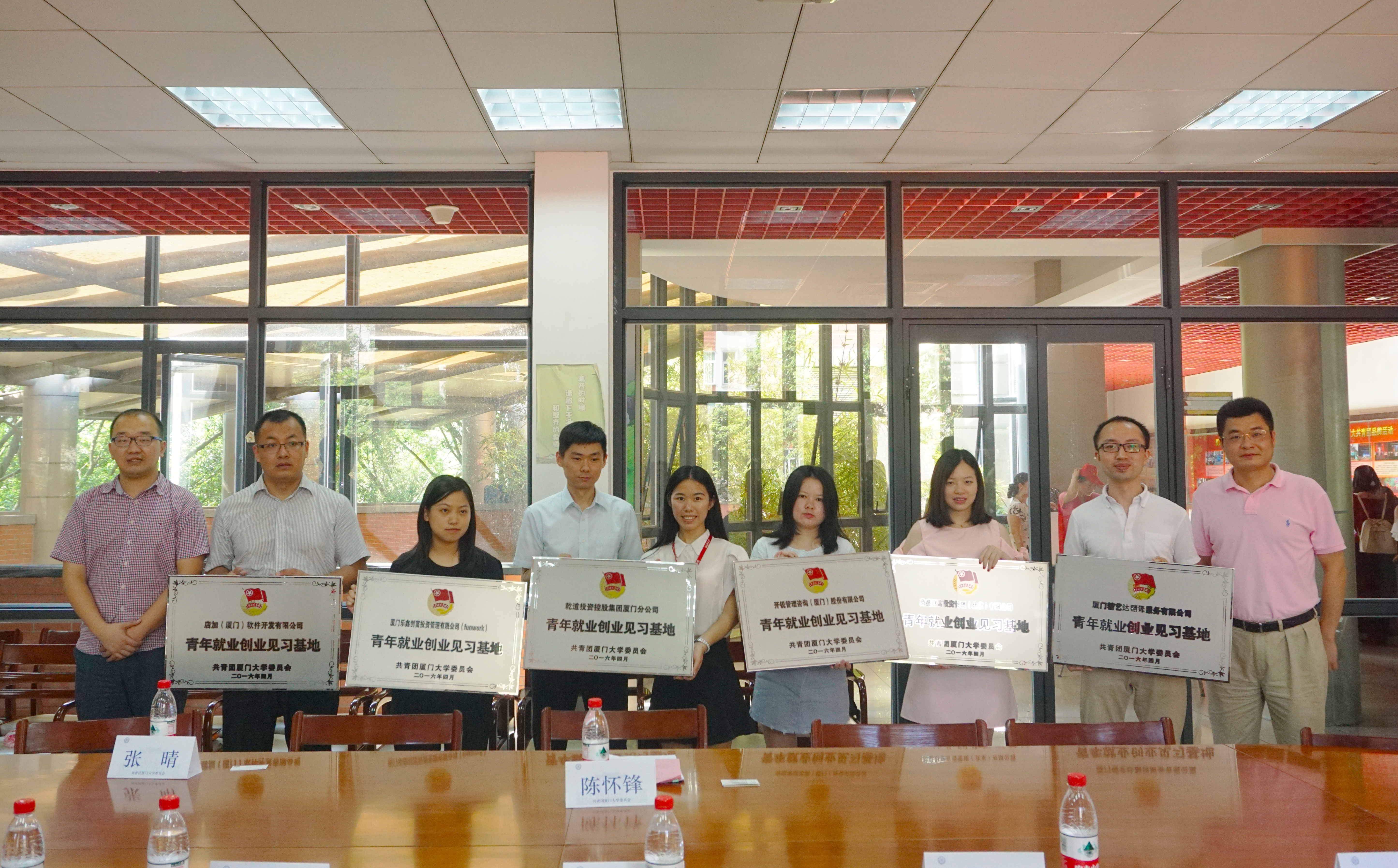 与此同时,共青团“青年就业创业见习基地”授牌仪式在思明校区自钦楼学生活动中心举办,乾道投资控股集团厦门分公司、鼎盛财富投资管理有限公司、开锐管理咨询股份有限公司、店加软件开发有限公司、厦门精艺达翻译服务有限公司、厦门乐鑫创富投资管理有限公司从校团委书记陈怀锋手中接过了见习基地牌匾。在授牌仪式上,陈怀锋感谢各企业为厦大学子扩宽就业视野、培养就业技能提供了宝贵机会,并希望通过见习基地的设立与各企业建立更为广泛的合作关系,共同为大学生提供更加广阔的发展平台。