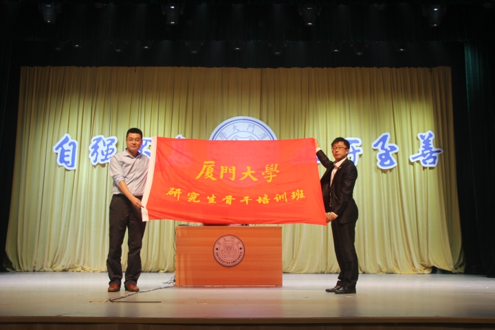 老学员代表、中国大学生骨干培养学校第九期学员、校研究生会主席赵斌同学结合个人经历与在场的新学员分享了他参加全国、福建省、学校三个层面组织的学生骨干培训班的心得与收获。他表示学生骨干是老师和广大同学之间的桥梁和纽带,要加强理论学习,不做理论的矮子,要长骨气,存骨感,当骨干,以高度的责任心,全心全意为广大同学服务。新学员代表、公共事务学院2014级本科生田耀东同学表示将牢记习近平总书记对青年学生提出的“勤学、修德、明辨、笃实”的要求,认真学习,正确处理好专业学习与学生工作的关系,做可信、可爱、可为的学生骨干和走在时代前列的奋进者、开拓者、奉献者。仪式上,校团委书记陈怀锋向学生骨干培训班、研究生骨干培训班授旗,本次骨干培训班正式启动。