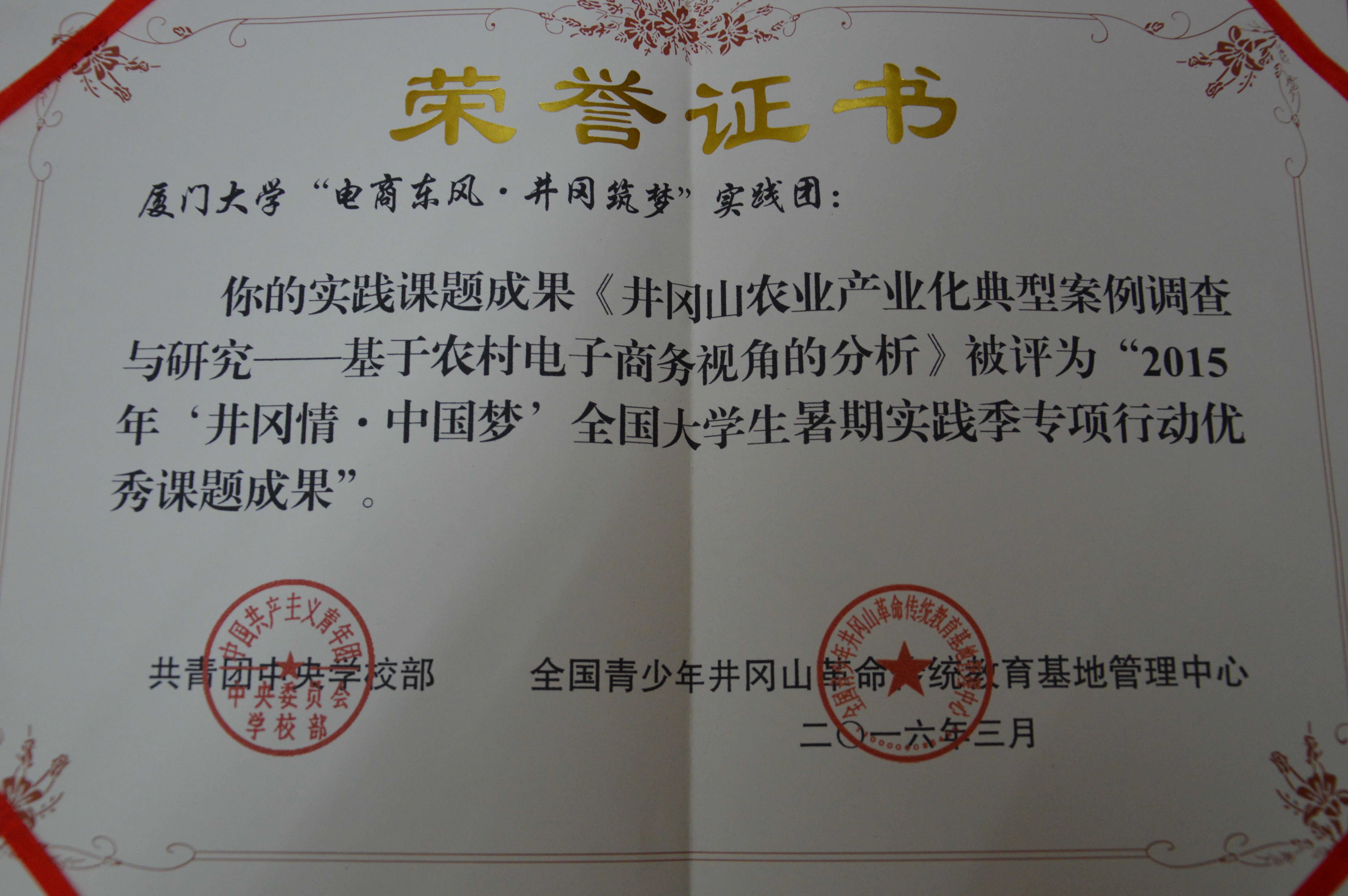 据悉,2015年“井冈情·中国梦”全国大学生暑期实践季专项行动前期共有全国492所高校的812个团队申报,最终有180支团队通过选拔获得实践资格。厦门大学“电商东风·井冈筑梦”实践团基于井冈山的农业发展现状,结合“互联网+”的提出以及农村电子商务迅猛发展的趋势,选定《井冈山农业产业化典型案例调查与研究——基于农村电子商务视角的分析》为调研课题参与申报,以高质量的课题申报书成功入选团中央2015年重点实践团队,福建省仅有3个团队入选。实践团于2015年8月12日—20日赴井冈山开展社会实践,围绕“政府、企业、农户”三大主体展开调研。分别对井冈山市委农工部、吉安市电子商务协会等政府部门及相关单位;井冈山市相关企业和商铺;井冈山市茨坪村、坝上村、文泉村3个村庄的农户进行访谈,调研得出相关结论。基于实践调研资料,认真总结,形成《井冈山农业产业化典型案例调查与研究——基于农村电子商务视角的分析》调研报告、《课题实施方案》微视频等形式多样、内容丰富的实践成果。实践活动被人民网、中国青年报、中国大学生在线、中国高校之窗、东南网、吉安商网、厦门大学等国家、省市、院校各级各类媒体报道100余篇次。