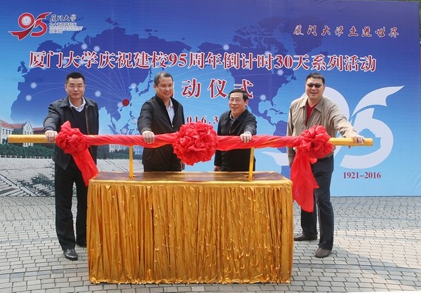 3月6日上午,厦门大学庆祝建校95周年倒计时30天系列活动正式在三家村广场拉开序幕。学校党委副书记、副校长李建发,党委副书记林东伟,学生处处长夏侯建兵,校团委书记陈怀锋以及校学生会、研究生会等学生组织成员、校庆志愿者代表,校马研班第六期学员以及各学院师生代表参加启动仪式。仪式由学生处副处长王洁松主持。
