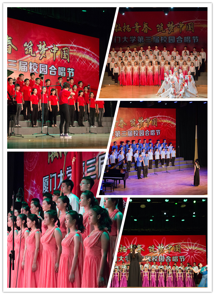 5月17日晚,厦门大学第三届校园合唱节汇演活动在建南大会堂举行。此次活动的主题是铭记历史,弘扬民族精神,纪念反法西斯和抗日战争胜利70周年。活动由校团委主办,学生艺术团承办,共吸引全校24个学院、近千名学生参与。同时,艺术学院声乐专业学生担任各学院合唱团的教学、排练。