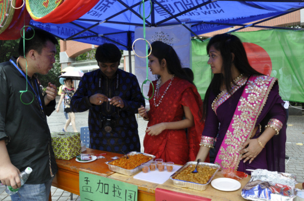 上午十点整,活动在思明校区拉开帷幕,分为风情展示、美食品尝与文艺汇演三个部分。各国的展位装饰精致,各具特色,展位前人声鼎沸,络绎不绝。韩国留学生带来了韩国传统服饰并且提供试穿,还在一旁设立了投掷游戏;印尼留学生身穿民族服饰,热情地为同学们提供咖喱拌饭;马来西亚留学生在准备美食的同时,为大家生动的讲解马来文化与中华文化间千丝万缕的历史渊源。同时,加纳特色的B-Box、韩国热情洋溢的舞蹈、马来西亚温情的歌声在广场中心的舞台轮番上演,让前来参加活动的同学们享受了一场全方位的文化盛宴。活动中,留学生们身着各国各民族特色服饰,在展位上摆满富有民族风情的美食、挂饰、海报、明信片等,活动现场俨然变成了一个“小型地球村”。各个国家的国旗/区旗交相辉映,象征着在厦门大学这个温暖的大家庭中,海外留学生和中国学生融洽相处。与此同时,翔安校区的国际文化交流节也开展得如火如荼。让人啧啧称奇的泰国新年拜年仪式和极具泰国风情的泼水节更为本次活动增添了色彩。