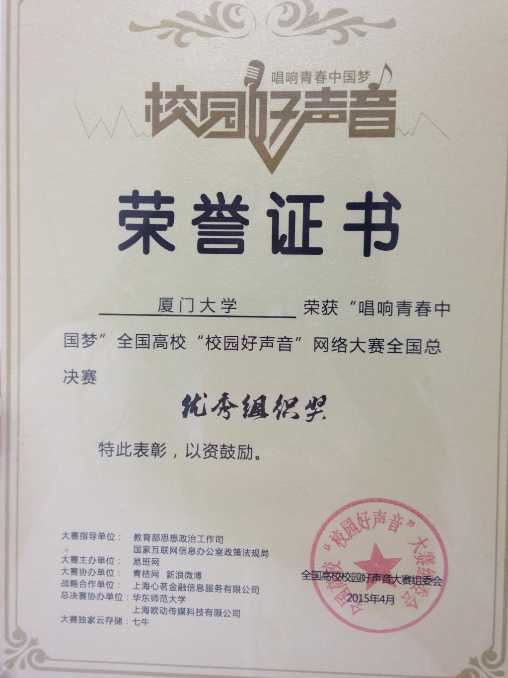 4月11日晚的首届全校“校园好声音”四强巅峰争霸战上,厦门大学战队在华东师范大学激情唱响,经过将近四个小时的激烈争夺,一举夺得季军宝座!同时,厦门大学也获得了优秀组织奖。