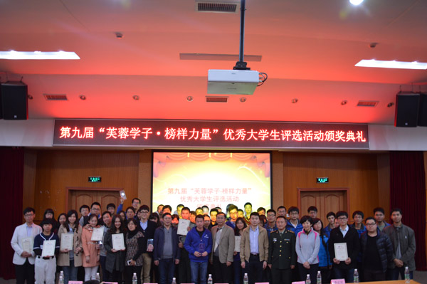 2014年12月24日晚,第九届“芙蓉学子·榜样力量”优秀大学生评选活动颁奖典礼在我校化学报告厅隆重举行。湖南中烟工业有限责任公司驻地代表沈善才、南京军区驻厦门大学军官选培办罗旭中校、校党委宣传部副部长楼红英、学生工作处副处长宋友良、信息科学与技术学院党委副书记李承华、校团委副书记廖晓波、卢成浩出席典礼并为获奖团队及个人颁奖。