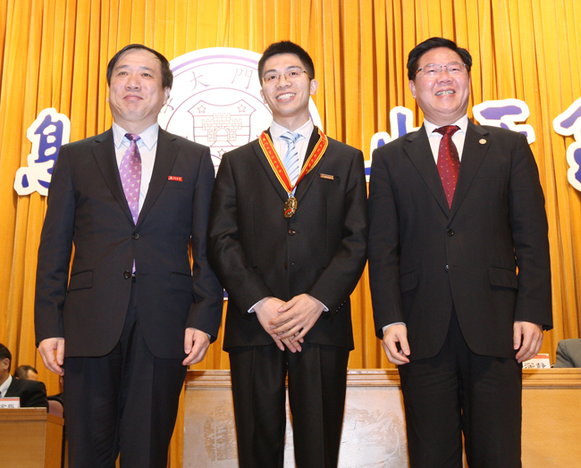 副校长邬大光宣读2014年度各项奖教金、嘉庚奖章、各项奖学金的获得者名单。获得“南强杰出贡献奖”的是田昭武院士、唐崇惕院士、邓子基教授、潘懋元教授。学校对“《长征组歌》赴新马交流演出团”、厦门大学中国国际太阳能十项全能竞赛代表团、雏凤团队(获2013年全国大学生数学建模竞赛最高奖“高教社杯”奖)、化学化工学院2010级博士生朱从青给予通令嘉奖,其中,朱从青获得“嘉庚奖章”。
