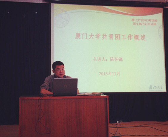 校团委书记陈怀锋先是向同学们讲述了大学生培养的五个层级目标、共青团组织工作的根本职责和任务。接着为参训学员做了我校共青团工作概述,围绕厦门大学团学组织基本情况和团学重点工作两大部分的内容展开,详细讲述了校团委团员思想引领、“社会实践、创新创业、志愿服务、校园文化活动”四大育人平台建设和团组织、学生组织骨干培养计划,鼓励团支部书记紧紧围绕学校团学工作设计团支部活动,做好基层团的工作。