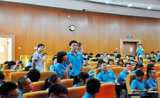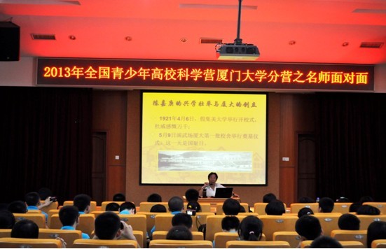 厦门大学首批“十大名师”之一的朱水涌教授以介绍厦大的校舍布局开讲,从陈嘉庚对厦门大学各历史时期“一主四从”建筑群的影响入手,慷慨激昂地讲述了陈嘉庚为南方教育王国的梦想所做的种种努力,言语中不无表达了对校主陈嘉庚的钦佩与敬仰之情。朱教授以其幽默、诙谐、精辟的语言娓娓道来厦大往事,热烈的掌声此起彼伏。“陈嘉庚的兴学壮举与厦大的创立”、“演武场与厦大选址故事”、“‘坐不更名行不改姓’的中原风骨”……,一个立体的厦门大学瞬间栩栩如生的呈现在大家眼前,令人遐想、使人向往,激发了全体营员对厦门大学这所百年名校由衷的仰慕之情和无限的自豪感。期间也不时穿插些与厦门大学紧密联系的如鲁迅、陈景润等各路豪杰的趣事,为同学们打开了了解厦门大学及其长期积淀文化底蕴的另一扇窗。最后,他勉励大家在学好科学知识的同时,也要重视人文知识的积累,真正做好文理融会贯通,争取把自己培养成兼具人文和科技素养的综合型人才。