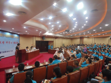 7月30日上午,2013年全国青少年高校科学营厦门大学分营开营仪式在克立楼三楼报告厅隆重举行。省科协巡视员陈永红教授,省教育厅巡视员李金莲教授,厦门市科协党组书记、副主席林芝建,厦门大学副校长邬大光教授,中国科协青少年科技中心科普服务处处长王松光等领导出席了开营仪式,仪式由厦门大学校团委副书记孙佳主持。