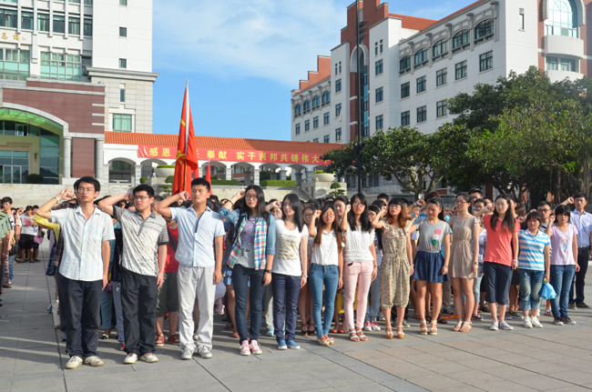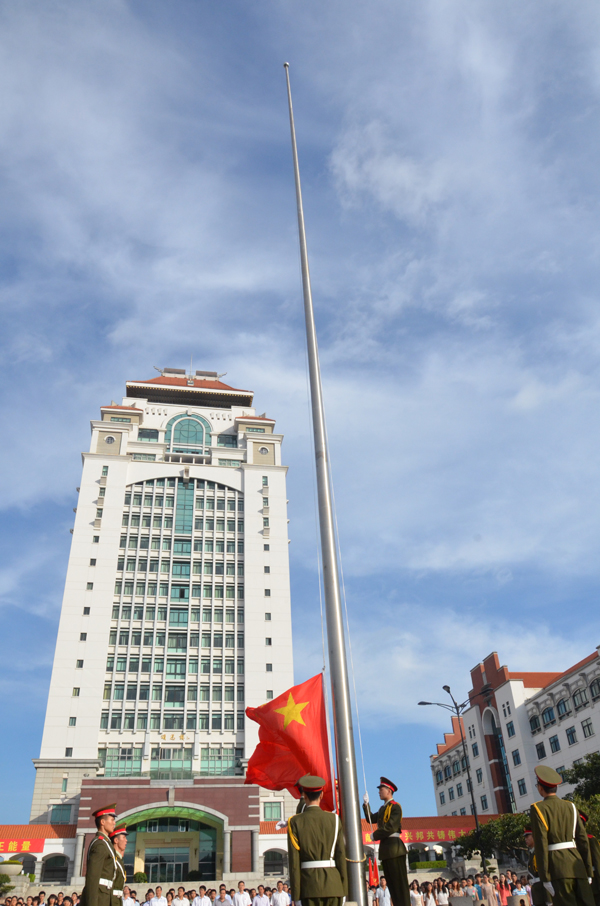 在国防生军乐团演奏的乐曲声中,旗手们迈着整齐划一的步伐,正步走,护送国旗到达升旗台。鲜艳的五星红旗在雄壮的国旗声中缓缓升起,飘扬在厦大的上空,众人心中荡漾着自豪感与荣誉感。