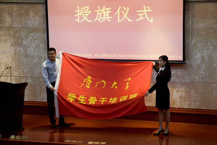 开班仪式上,校团委书记陈怀锋老师为骨干培训班授旗,全体学员齐唱校歌。