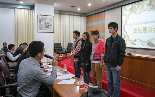 2012年12月29日,由校团委主办、厦大青年宣传中心承办的第八期学生宣传骨干培训班课题成果评审展示会在颂恩楼220报告厅隆重举行。校宣传部秘书李静老师、学生处教育科科长陈泗林老师、公共卫生学院团委书记黄佳佳老师、软件学院团委副书记李绍玉老师、数学科学学院团委副书记陈向柳老师担任作品评审,校团委副书记葛郝锐应邀参加展示会。经过3个多小时的精彩展示,第四组以34.44分的最高分斩获第一名,第五组、第七组和第十六组分别荣获第二名、三、四名。