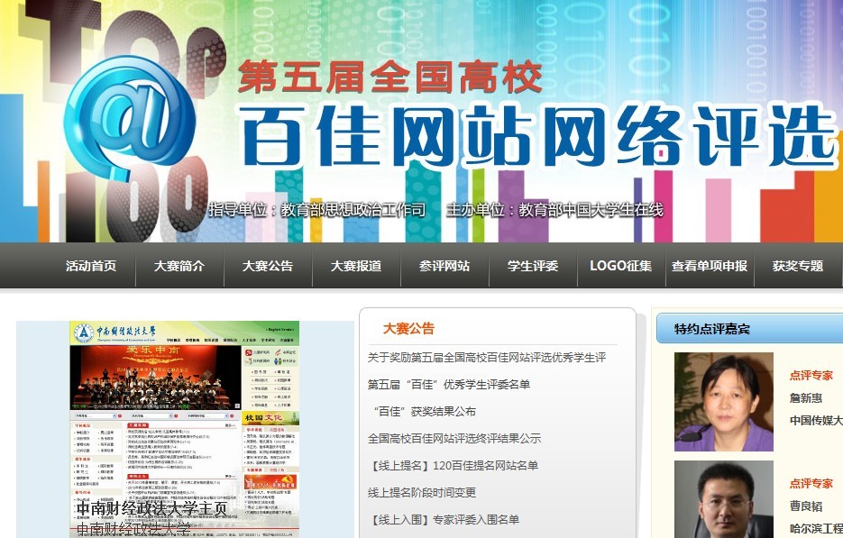 全国高校百佳网站网络评选活动由教育部思政司指导,中国大学生在线主办,是唯一覆盖全国高校、针对高校网站建设开展的评选活动。该活动每两年举行一次,活动自2006年举办第一届以来,通过不断优化评选环节,积极主动服务师生,发挥引领示范作用,逐渐成为全国高校校园网络文化建设的标志性品牌活动,被誉为全国高校校园网站的“百花奖”,是全国高校校园网络建设的风标。本次比赛于2012年上半年开始,共有来自全国30个省、自治区和直辖市的500多个高校网站报名参加,根据“第五届全国高校百佳网站网络活选方案”,经线上入围阶段、线上提名阶段、线下终评阶段,产生最终结果。