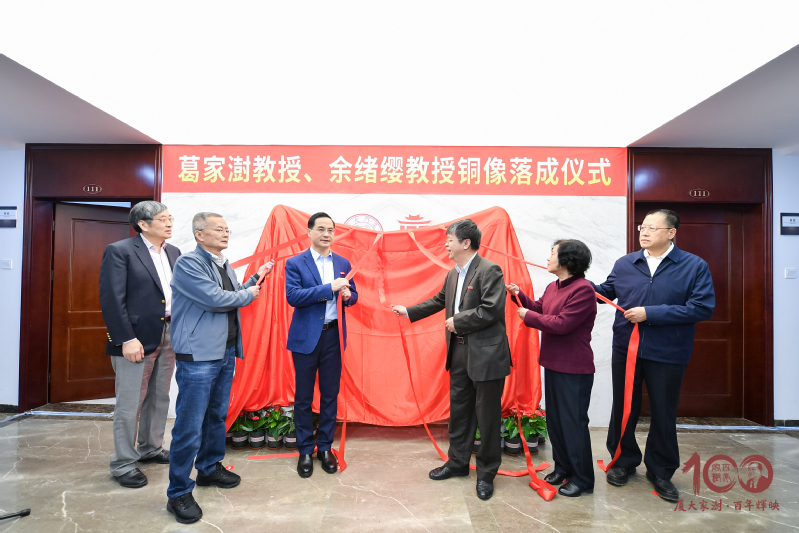 邱伟杰、邱七星、葛征平、苏锡嘉、陈伟琪、孙宝厚共同为葛家澍教授、余绪缨教授铜像揭幕。