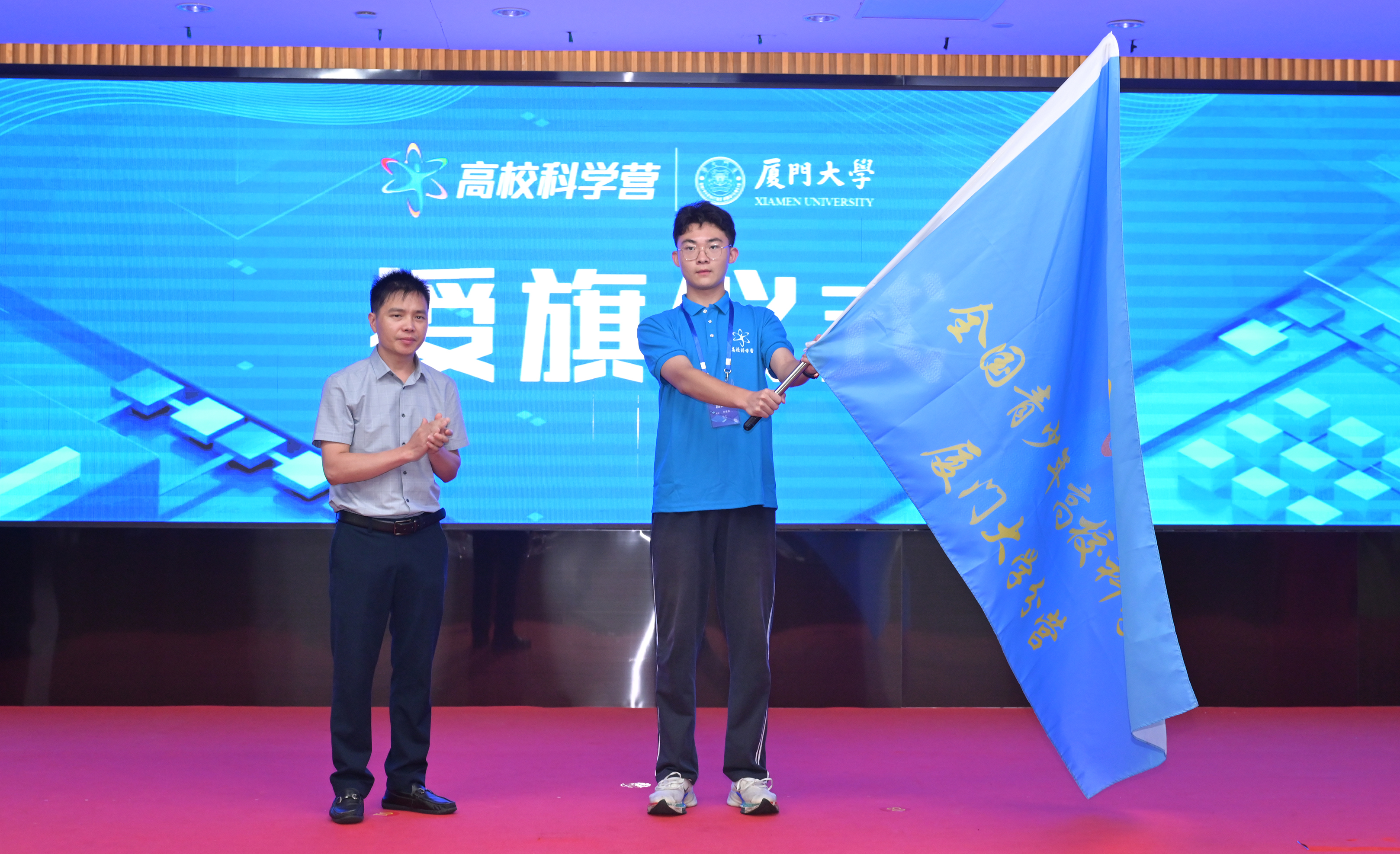 随后,与会领导共同启动科学营,并由福建省教育厅魏建龙向营员代表——泉州一中刘盛铭同学授营旗。
