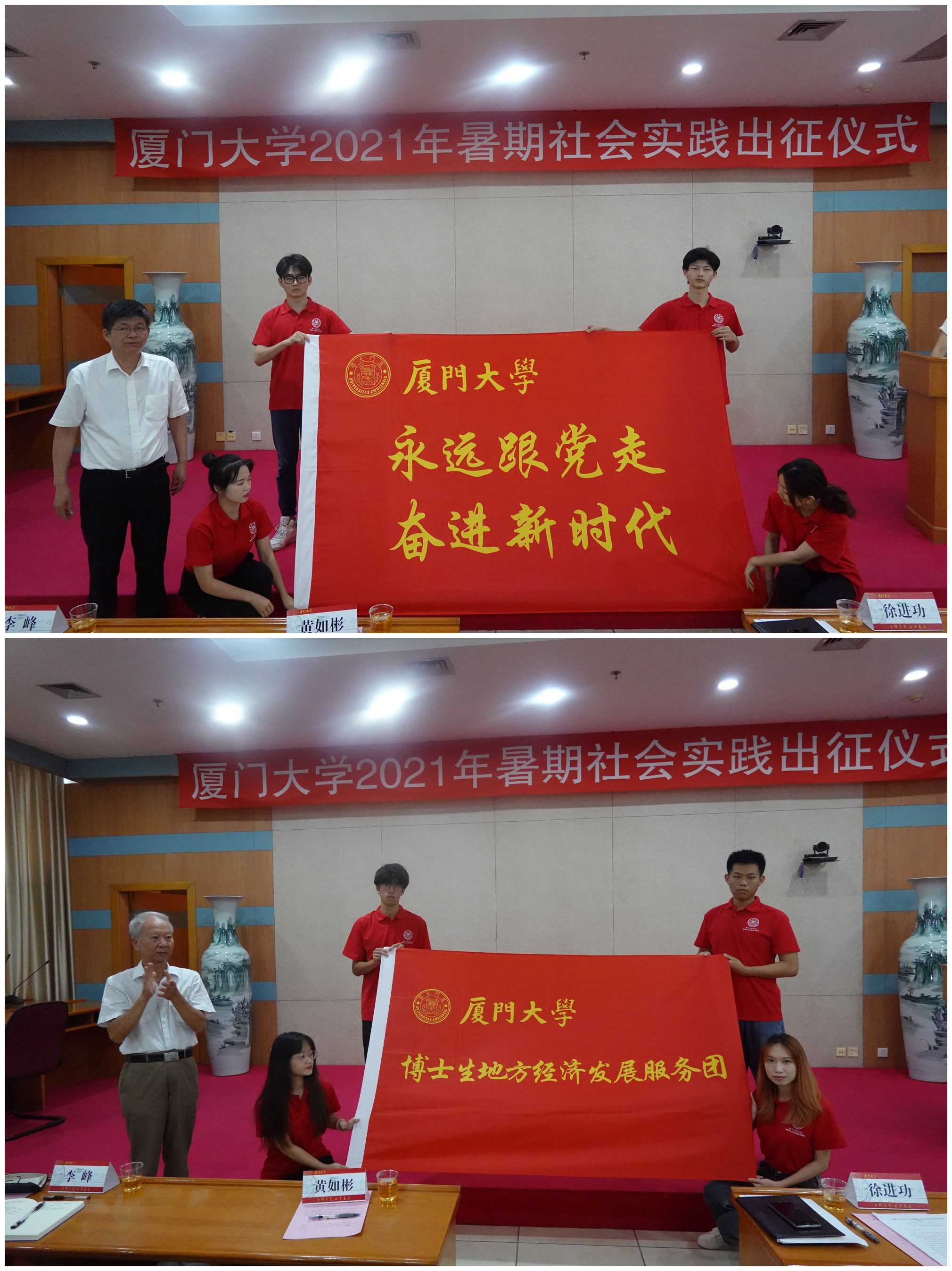 仪式上,黄如彬为博士生地方经济发展服务团授旗,徐进功为社会实践活动授主题旗。