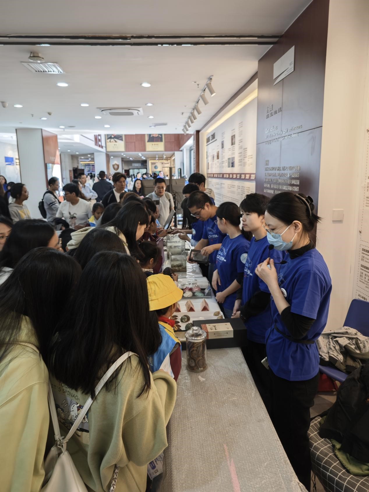 海洋地质团支部设立了“小巨人—显微镜下的微化石”展位。在团员志愿者的带领下,参访者纷纷使用显微镜观察有孔虫,对扫描电镜照片进行填色,并自制有孔虫化石,积极探索能够反演古气候的“小巨人”。