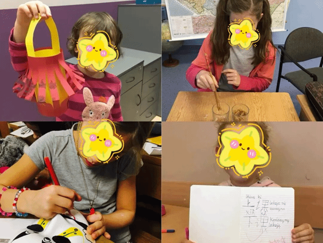 邱玉华的学生们在做灯笼、学习使用筷子、画京剧脸谱等