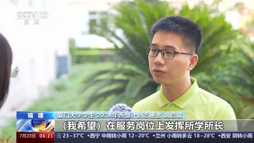 休学一年,从闽南到西北,央视镜头记录着少年的西部梦。7月23日,央视《新闻联播》《朝闻天下》特别报道了,2024年大学生志愿服务西部计划志愿者出征仪式,一位厦大学子以志愿者代表的身份接受采访。