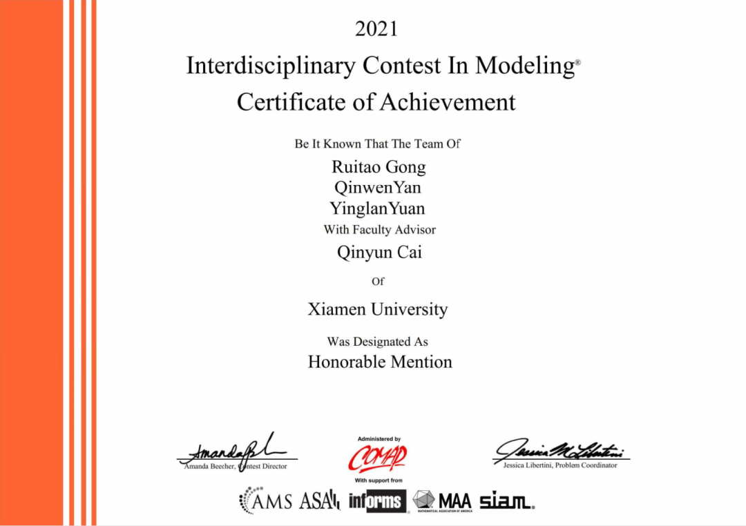 在课程学习之余,颜沁雯也在数学建模领域自学探索,毕竟经济和金融学的更高处一定需要更加深厚扎实的数理基础。大二寒假时,颜沁雯与同学院的两位同学组队,用一个月时间自学基本数学模型与python和MATLAB的编程方法,在全美大学生数学建模大赛(ICM)中通过建立国家高等教育评价体系并基于其分析南美国家教育情况,获得二等奖(Honorable Mention)的好成绩。