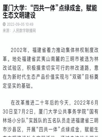 行思千里,方能真正落所学于实际。在大一时,沈晓菲和学姐共同前往武夷山调研,初次感受到了田野调查的魅力。“我想,多年后再回首大学时光,最令我难忘的一定是那些在田野中与村民们亲切交流的日子。”此后,她也常常带领着学弟学妹们深入田野之中。两年来,沈晓菲多次参与暑期“三下乡”社会实践活动,前往南平市、三明市等地进行调研,累积走访超二十个村庄与政府单位。她与团队多次获评厦门大学社会实践积极分子、优秀社会实践团队、优秀调研论文等荣誉,实践成果也得到人民日报社报道。她用实际行动践行着公共事务学院“立学公事、立心天地、立命生民”的院训。