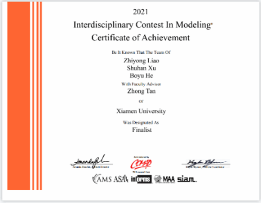 廖智勇获得美国大学生数学建模竞赛F奖(特等奖提名)