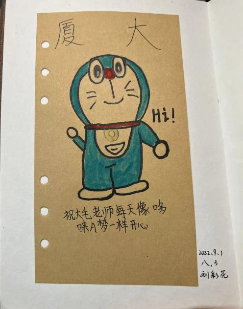 在西北支教的一个晚上,两个素不相识的小姑娘跑到我的宿舍,送给我一张画。画上是一只哆啦A梦,下面写着“祝老师每天像哆啦A梦一样开心”。